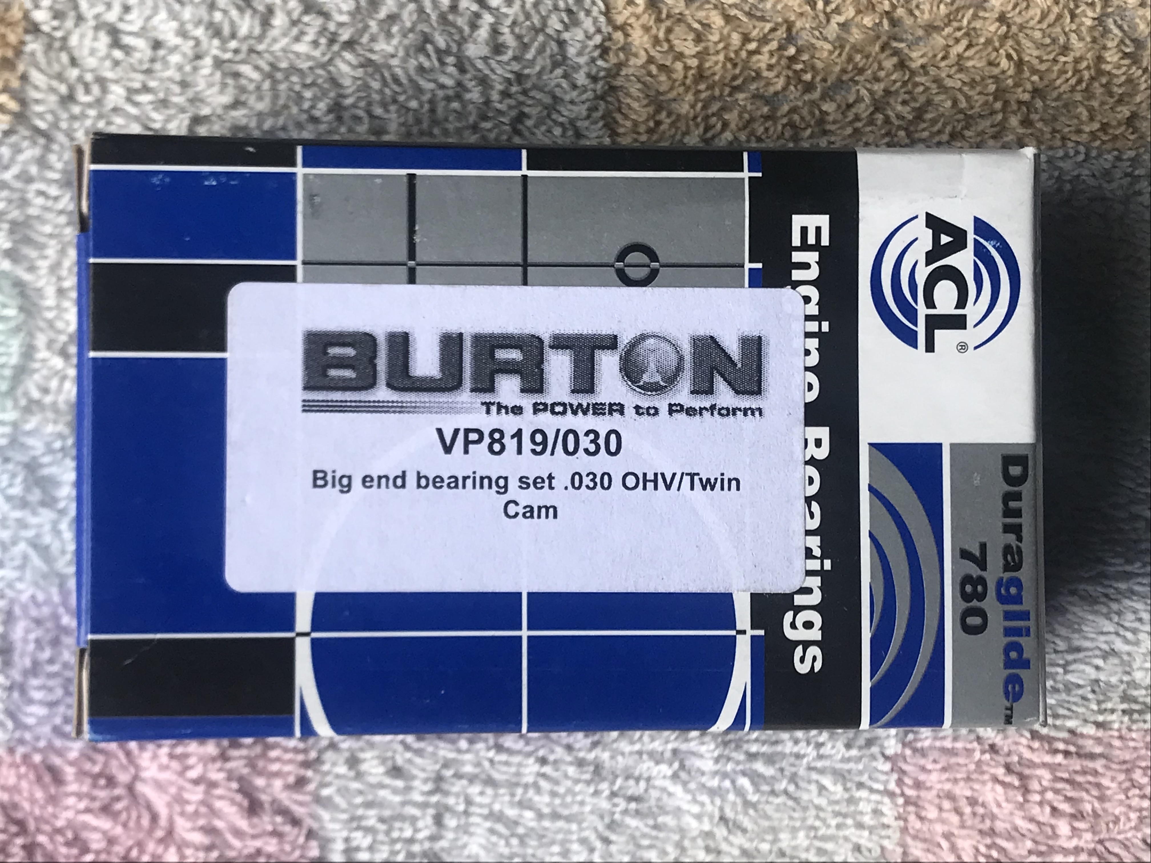 - un jeu de coussinets de bielle Burton VP819/030, neuf en emballage d'origine non ouvert (erreur de commande), pour paliers bielle sur vilebrequin (big end) rectifiés à -0,030" (undersize), largeur palier 22,35 mm, diamètre palier compris entre 48,438 et 48,451 mm (1,9070 et 1,9075" soit -0,030" par rapport au diamètre standard), matériau HD lead copper : 40€